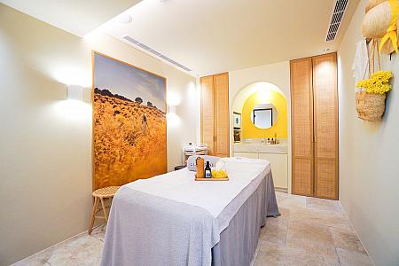 準備が整ったら個室へ移動します。本日のお部屋は「イモーテル(immortelle)」。ロクシタンのシグネチャーである野に咲く力強い黄色い小花をイメージしたインテリアが施されています。