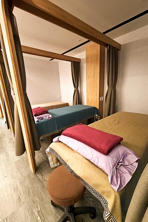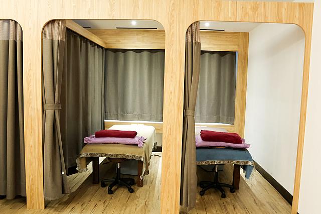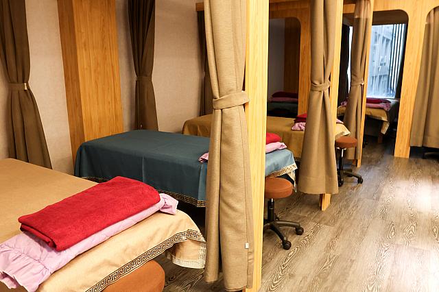 伝統的なマッサージ店らしく、マッサージベッドの仕切りは自由自在なカーテンに。これなら、カップルやグループで個室風に区切ることもできるし、1人で訪れた場合も人の気配を感じながらプライベート空間を守ることができるし、なかなかの快適&安心設計です。