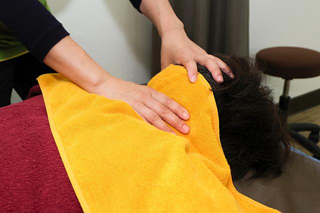 マッサージ不足の場所がないか確認したら仰向けになって、さらにマッサージは続きます。ツボが集中する股関節周りや腕の付け根、さらに頭部、首から肩。特に肩はベッドに座って集中してほぐしてくれる施術までありますよ。気持ちいい~♡