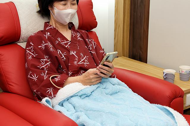 足裏マッサージ椅子の横にはそれぞれコンセント付のテーブルがあります。TVはありませんが、無料Wi-Fiサービスがあり。充電しながらスマホでネットを楽しめるのはうれしいですね。充電用のコンセントは持参してください。