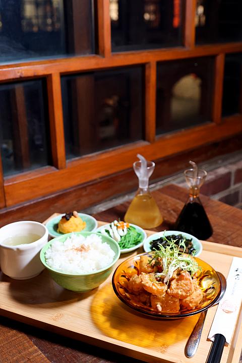 金沙蝦球(エビボールから揚げの金沙粉和え)/セット400元、単品300元肉厚な大白エビを香ばしく揚げ、塩漬けした卵黄でじっくりと炒め合わせた人気の一皿。プリッと弾けるエビの食感に加え、シャキシャキとした豆薯(クズイモ)が心地よいアクセントになっています。さらに、迪化街の乾物店で扱われるミックスナッツを添え、食感と風味のコントラストも楽しめます。
