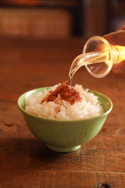 二口目からは、台湾の人々にとって懐かしさを誘う食べ方に挑戦を。「豚油をふた回し、醤油をひと回し」、これが台湾流の黄金バランスだそう。豚油は温かい状態で運ばれてくるので、油が固まる前に白米に回しかけるのをお忘れなく。