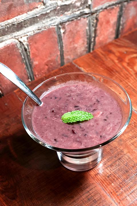 紅豆紫米芋頭露(小豆・紫米・タロイモのデザートスープ) 100元。紫米のぷちぷちした食感と、小豆、タロイモのほどよい甘さがマッチした、やさしいデザートスープ。冬は温かい状態で提供されます。