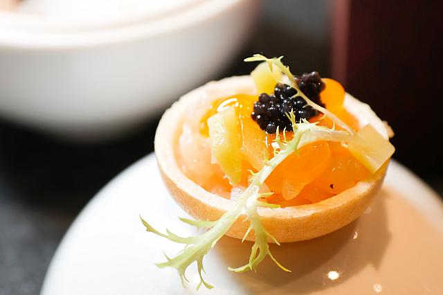 前菜はひと口サイズの3品で。もなかの器に隠れているのが北海道産のホタテです。そのまま食べてもよいほど新鮮さだから鉄板ではサッと炙る程度に。青マンゴーでアクセントをつけたタルタルソースでいただきます。キャビアの塩気もイイ感じ!爽やかなひと品です。