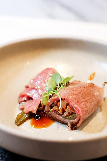 ■肉料理│季節の野菜と青トウガラシ漬けの牛肉巻き ワサビ醬油がけ剝皮辣椒時蔬牛肉捲・山椒醬油剝皮辣椒とは、台湾東部の原住民料理でよく使われている青トウガラシを漬けた漬物の1 種。そんな台湾らしい味わいを、旬の野菜と共に薄切り牛肉で巻いてサッと焼き上げたのがこちらです。
