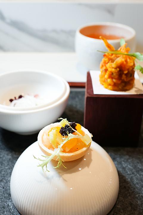 干貝塔塔最中餅・柔煮章魚・野菜天婦羅年糕
