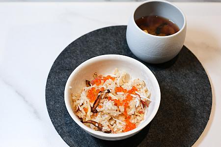 ■お食事│タラバガニとタケノコの焼き飯とみそ汁雪場蟹鐵板燜飯・味噌湯タラバガニと台湾産のタケノコ、原木シイタケを合わせた焼き飯です。それぞれの食材が持つおいしさが鉄板の上で混ざり合い、ひいては口の中にさまざまなハーモニーを生み出します。トッピングのイクラの塩気もよきアクセントに。
