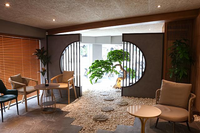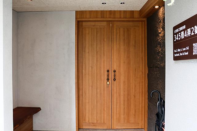 ヴィンテージマンションの1階にある「DOWA道和日式鉄板焼」の目印は、屋根から延びる草木のカーテン。重厚な木のドアを押し開けて中へ入りましょう。すると、禅ムードが漂う待ち合いスペースが現れます。