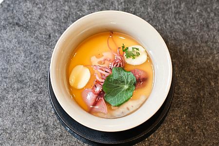 「主役は魚なの⁉」と思ってしまうほど具だくさんな贅沢スープに仕立てています。添えられた柚子がふわりとかおってイイ感じ♪