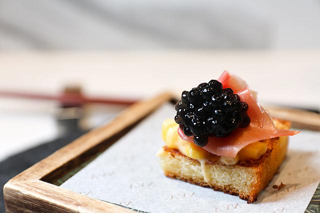 (■おもてなし│生ハムとキャビアのオープントーストサンド)(魚子醬襪生火腿起司玉米)2025年11月ランチ限定のサービスとして、特別にサーブされたのが生ハムとキャビアのオープンサンドイッチです。鉄板でトーストした食パンはサックサク♡その上に載った生ハム、キャビア、トウモロコシ、チーズの異なる食感と味わいが口の中で混ざり合い、おいしさの波状攻撃が続きます。