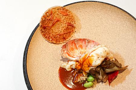 生け簀から上げたばかりの活きた太平洋産のロブスターは、サッと火を入れただけだからプリプリ~!噛むほどにロブスターの甘みがじゅわります♡ソースはエビみそ仕立てで。