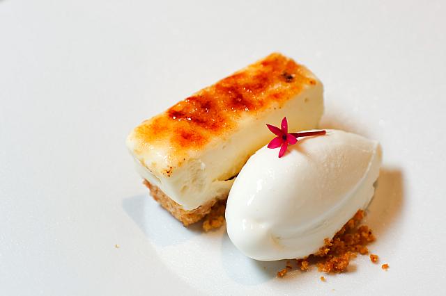 ■デザート│キャラメルレアチーズケーキのはちみつアイス添え焦糖生乳酪・蜂蜜冰淇淋デザートは濃厚だけど軽い口当たりのスフレチーズケーキを。カリカリ食感のキャラメリーゼが楽しさをプラスしてくれます。