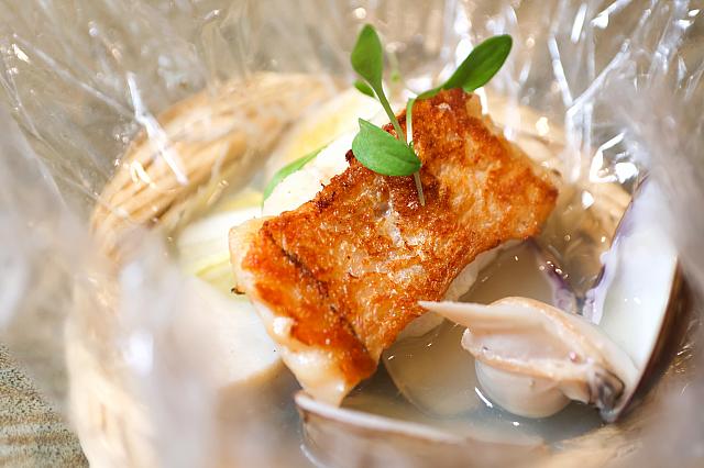 外はカリっと、中はふっくらと強火で旬の白身魚を焼き上げたら、ハマグリやキノコと共に調理用耐熱フィルムで包み焼きに。この日の魚は台湾でポピュラーな午仔魚(ミナミコノシロ)。魚介類の旨味が閉じ込められているから、シンプルだけど濃厚な海の幸・山の幸が感じられるひと品に。