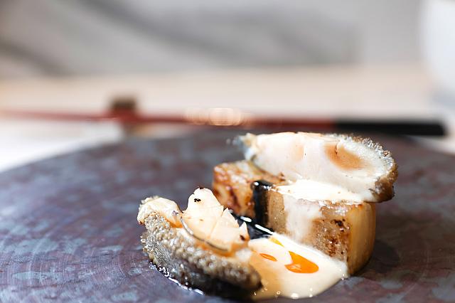 ■海鮮①│アワビのはまぐりバターソース&イカスミソース添え南非鮑魚・奶油蛤蠣醬・墨魚貝汁晩夏から初秋にかけてが1番の食べ頃という南アフリカ産の活アワビを使用。鉄板で蒸し焼きにして甘みをギュッと閉じ込めます。添えるのはイカスミのアクセントを効かせたアサリとバターの濃厚ソース。クリーミーな味わいが楽しめます。
