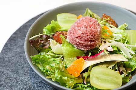 ■箸休め│柚子ドレッシングのフレッシュサラダ ブドウソルベ添え葡萄三重奏・柚香油醋・魚菜共生生菜沙拉フレッシュサラダでお口のリセットを。マスカットや自家製干しブドウ、ブドウのシャーベットがユニークなアクセントになっています。ドレッシングは柚子ビネガーベース。さっぱり&すっきりとした味わいです。