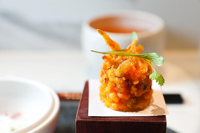 台湾料理の米糕(おこわ)みたいなのが天ぷら。餅、桜エビ、旬の野菜をさっくりと揚げて、中はもっちり。