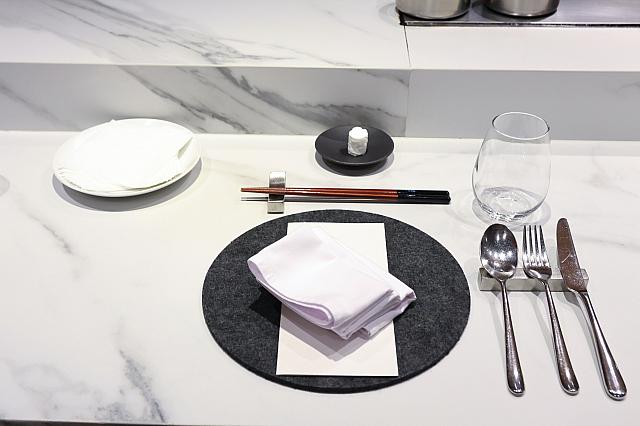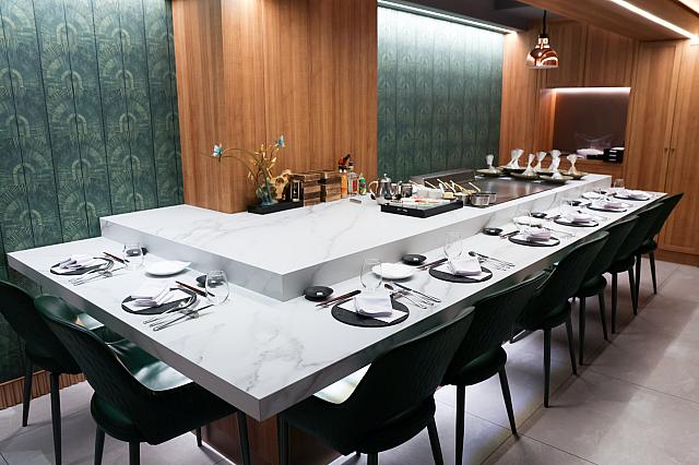 そここそが食のステージ。鉄板を囲むようにL字型に10人が座れる大理石のカウンターテーブルが置かれています。隣にはもう1部屋。こちらも同じく鉄板を囲むように8人掛けのカウンターテーブルが用意されていました。