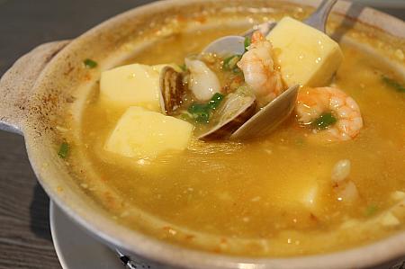 身体が芯から温まる煮込み鍋。鍋といってもスープがトロトロであんかけのようになっています。グツグツとテーブルにやってきたら底からかき混ぜてから食べてください。貝や海老などの具がごっそりと中に入っています。カニ味噌の風味がたまらない一品です。