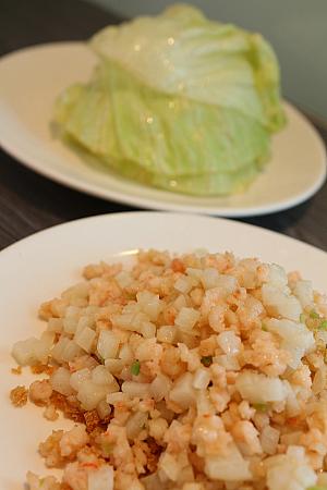 ナビのイチオシはこの料理。エビのそぼろにじゃがいものみじん切り、台湾の朝ごはんの定番、揚げパン(油條)をぱらぱらに砕いた香ばしい具をレタスで包んで食べます。揚げパンはシャキシャキの食感が楽しく、みずみずしいレタスと相性抜群。自分で好きなだけ具をのせて包んでも良いですし、スタッフに声をかければ取り分けてくれます。噛めば噛むほど味が増してきます。