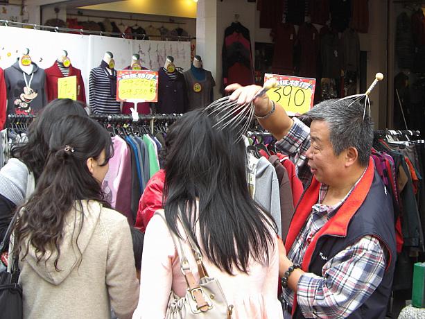 オジさんは針金のようなマッサージ器具を通行人の頭に刺してます。