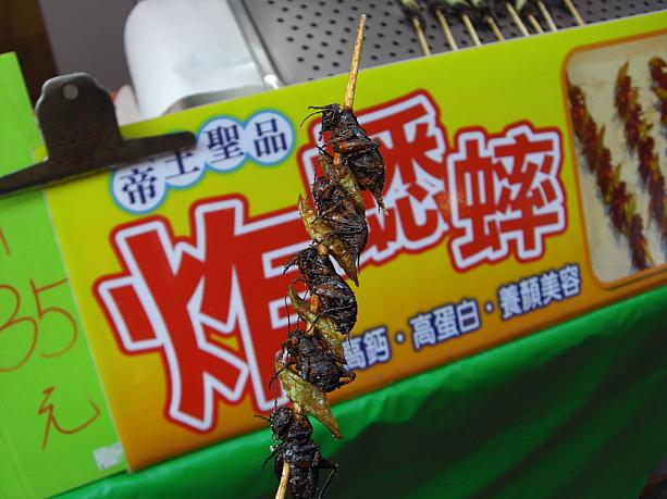 極めつけはなんと、コオロギの天ぷら!これには夜市好きのナビもびっくり。台湾でも、山間部のゲテものレストラン等にしか卸してないものだとか。(ナビ初体験です)