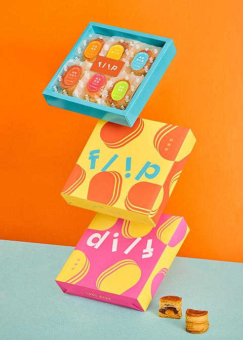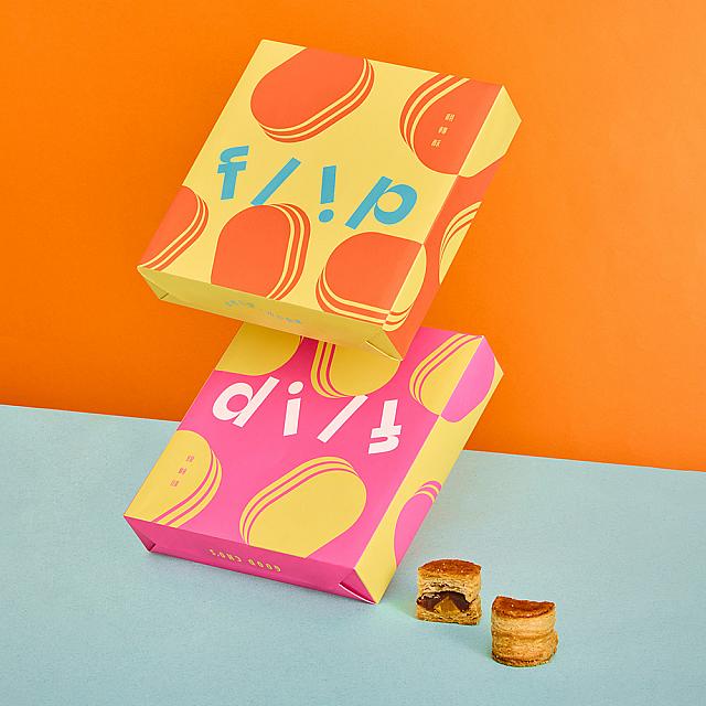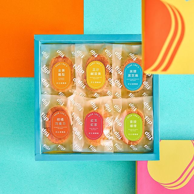 翻轉酥420元/箱内容:「豆沙鹹蛋黃」「金黃鳳梨」「黑糖黑芝麻」「柑橘巧克力」「香橙檸檬」「紅玉紅茶」各1個