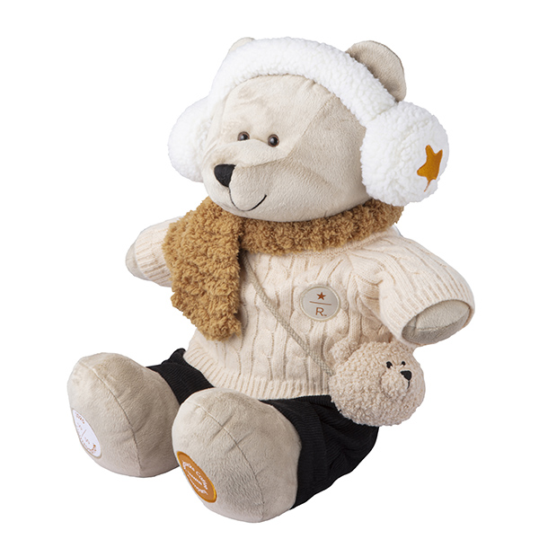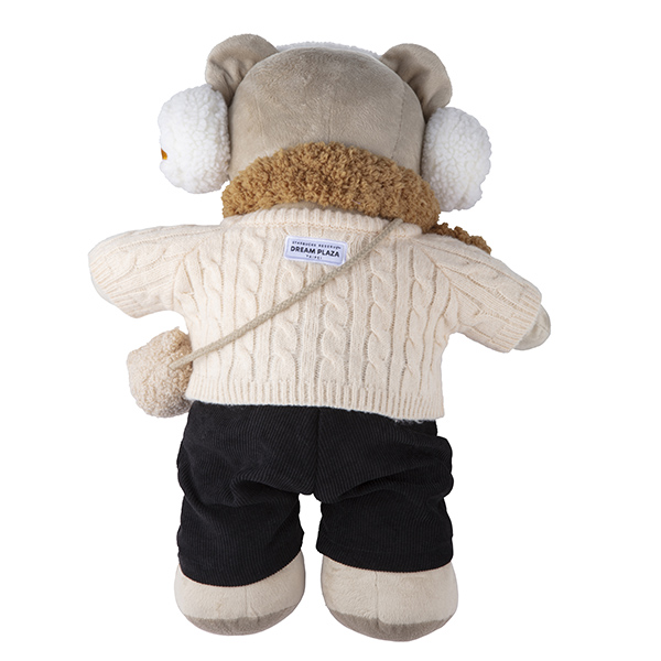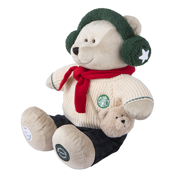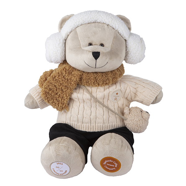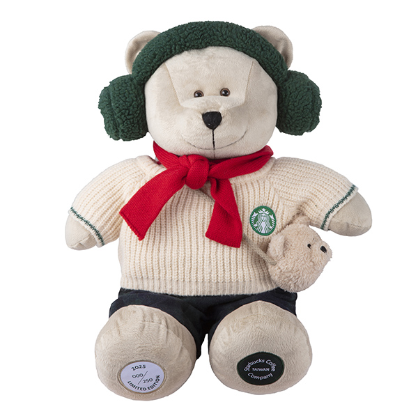 まずは台湾限定の「GIANTベアリスタ」ぬいぐるみでしょう。星型のイヤーマフ、ロゴ入りニットで、スタバブランドの緑色×アイボリーホワイトを合わせた冬に向けてぬくぬくの服装がキュートすぎなんです。ナビ的にツボなのが、ミニベアリスタの斜め掛けバッグをベアリスタがコーディネートしているところ♡めっちゃ自分のこと愛してる~!さらに足裏にシリアルナンバーが入って、特別感満載です。