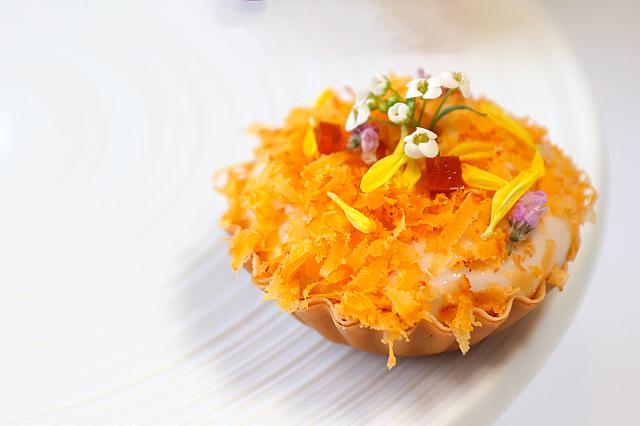 サクサクのタルトにパルマハム、燻製した大甲産タロイモのムース、自家製の塩漬け卵黄、そして乾燥エシャロットの粉末を層状に詰め込んだひと口サイズの前菜です。ほんのり主張するタロイモの風味が印象的でした。
