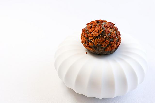 <B>④黑糖菠蘿黑松露泡芙</b><br><br>黒糖とゴマで作られたシューの中に、熟成コンテチーズと黒トリュフで仕立てた濃厚なチーズクリームが詰まった一品。ひと口頬張れば、トリュフの風味が口いっぱいに広がる、贅沢な一品でした。