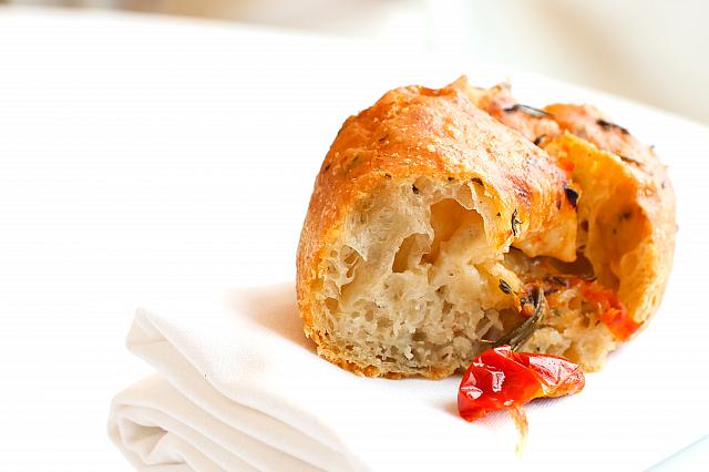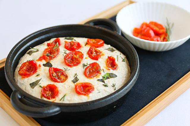 <b>自製現烤佛卡夏</b><br>自家製のフォカッチャを、焼きたてでいただけるのもうれしい。胃袋がもっと大きかったら、たくさん食べたかったなぁ……
