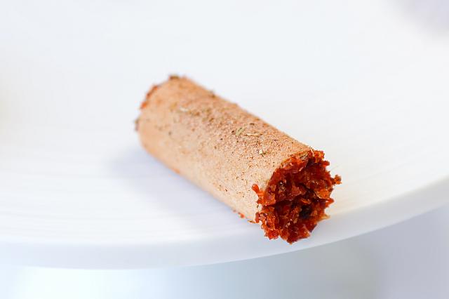 <B>義大利烤餅 燉肉醬 酸奶</b><br>フレンチコースと同様のアミューズを堪能したあとに運ばれてきました。クラッカーの下には、牛肉ソースと野菜ベースのマヨネーズがかくれています。クラッカーを割ってソースと絡めていただきます。牛肉のソースは台湾を感じる味付けで、ユニーク! <B>義大利烤餅 燉肉醬 酸奶</b><br>フレンチコースと同様のアミューズを堪能したあとに運ばれてきました。クラッカーの下には、牛肉ソースと野菜ベースのマヨネーズがかくれています。クラッカーを割ってソースと絡めていただきます。牛肉のソースは台湾を感じる味付けで、ユニーク!