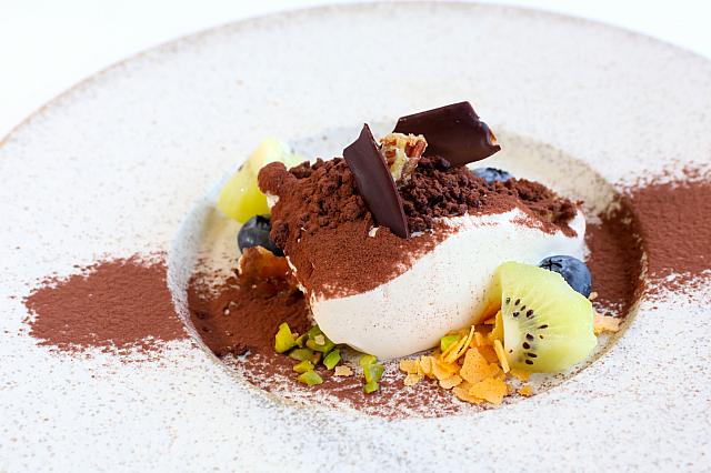 <B>布里起司/冬季黑松露/蜂蜜</b>(Bire Cheese/Winter Black Truffle/Honey)<br><br>お口直しのデザートに出てきたのは、ハチミツトリュフジャムがかかったヨーグルトアイスです。トリュフが香るデザートとは、斬新!ブリーチーズとぶどうの洋酒漬けとの組み合わせも抜群でした。