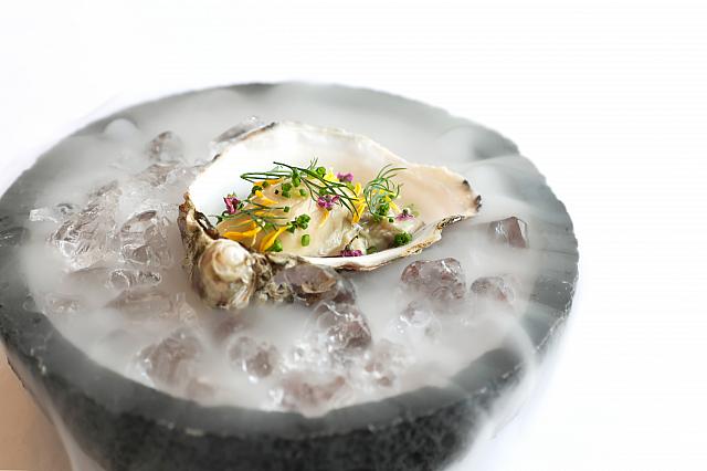 スモークされたフランス産生ガキの登場。カツオ出汁のジュレとキウイのサルサが添えられた、爽やかな一皿です。
