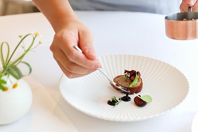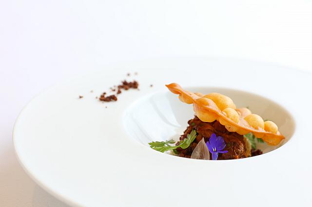 外側のパリッとした食感と、中から溶ける宜蘭産鴨のフォアグラ&生クリームムースとのコンビネーションが楽しい一品です。熟成した菜脯(干し大根)とニンニクの芽のパウダーがふりかかっており、台湾の余韻も感じられます。