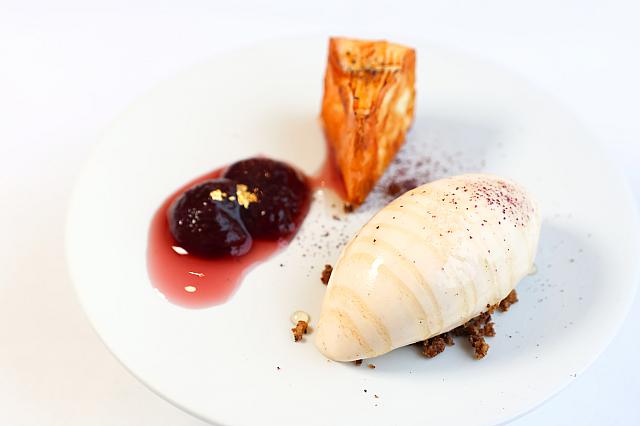 黒い殻をたたき割ると、ブリーチーズのソースとイチジクがこんにちは。視覚も楽しいデザートです。フレッシュチーズ「フロマージュ・ブラン」のアイス、ラベンダーの白ワインゼリー、黒麦のチップが添えられています。