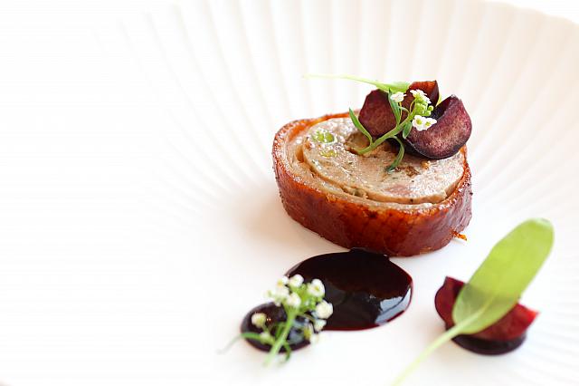 <b>北京鴨肉捲 廣式肝腸櫻桃</b>(Peking Duck Pie/Cantonese Liver Sausage/Cherries)<br><br>香ばしく焼き上げた北京ダックの中には、濃厚なレバーソーセージが詰まっています。火入れがすばらしく、パリッとした皮からジューシーな脂がじゅわっとあふれ出て、鴨肉の旨味を感じる一皿でした。