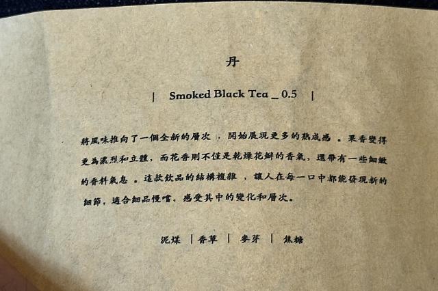 ナビが注文した「丹」260元の巻物に書かれている内容を要約すると『浅焙タイプで花香が繊細に広がる。果実の香りが立体的で、スパイスのニュアンスも感じられる』といったところ。うんうん、難しいことは言えないけど、えらく複雑で味わったことのない高貴な味がしました!燻製するとお茶がこんなにも趣深くなるのかと!大感動♡