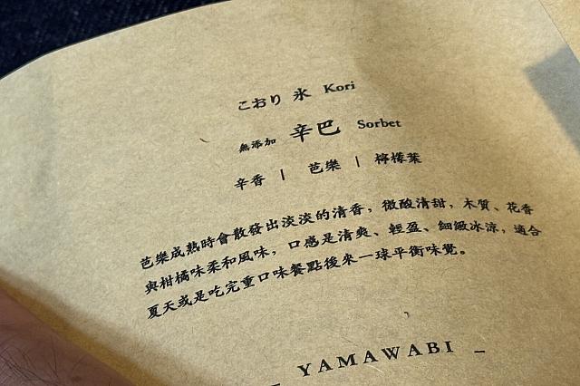 こおり氷 Sorbetは「辛巴」210元の巻物には……『マンゴーとレモンリーフが織りなす、夏にぴったりの爽快ソルベ』といったところ。ほのかな酸味と甘み、そして木と花の香りが見事に織りなしていて好き!水を一滴も加えず無添加だからこそ、素材のそのものの味を感じられます!