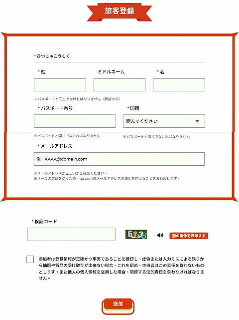 Q. 「遊・台湾で金運も開運も狙っちゃおう!」参加時からパスポートを更新・変更したためか、「資格無し」と表示されて登録できません。どうすればいいですか?A. 「遊・台湾で金運も開運も狙っちゃおう!」参加時のパスポート番号を入力してください。当選した場合、引き換え時に旧パスポートを必ず持参し、提示してください。