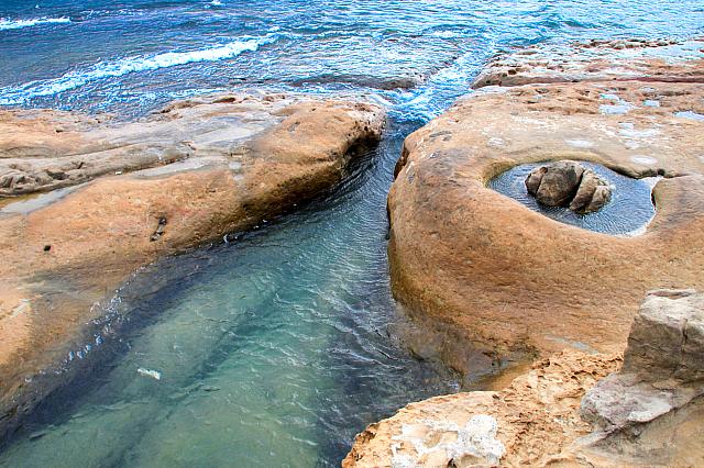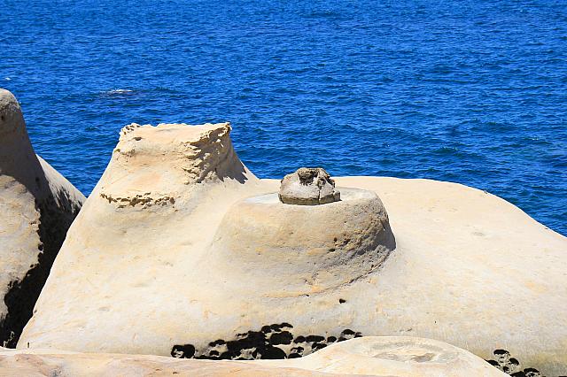 乳石と呼ばれる野柳特有の景観をつくる「燭台」は、層の中でも固めの石灰質が核となり、海水の浸食を受けて次第に露出してきたものです。ナビには台湾小吃のおこわ「米糕」に見えるんですけど!?