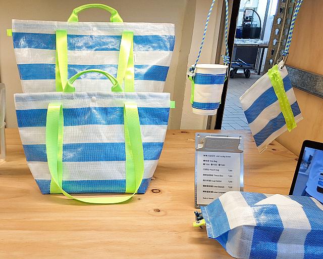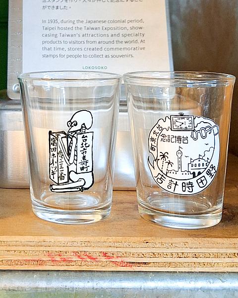 青×白の爽やかブルーシートのグッズが売れ筋!日本統治時代に開催された「台湾博覧会」のスタンプのイラストを描いたビールグラスやトートバッグは日本人観光客に大人気です