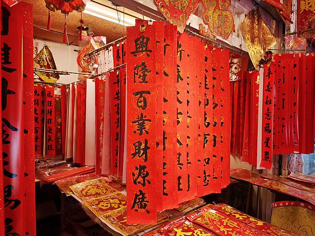 長~い「春聯(チュンリェン)」は、縁起のよい言葉が対句となった飾り物。幸運が訪れることを願って、玄関の両サイドに貼られることが多いです。