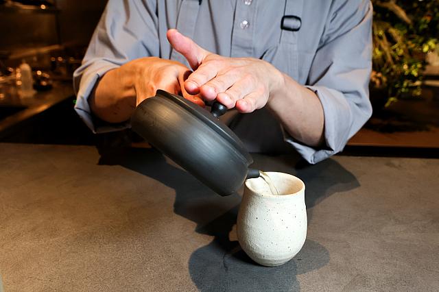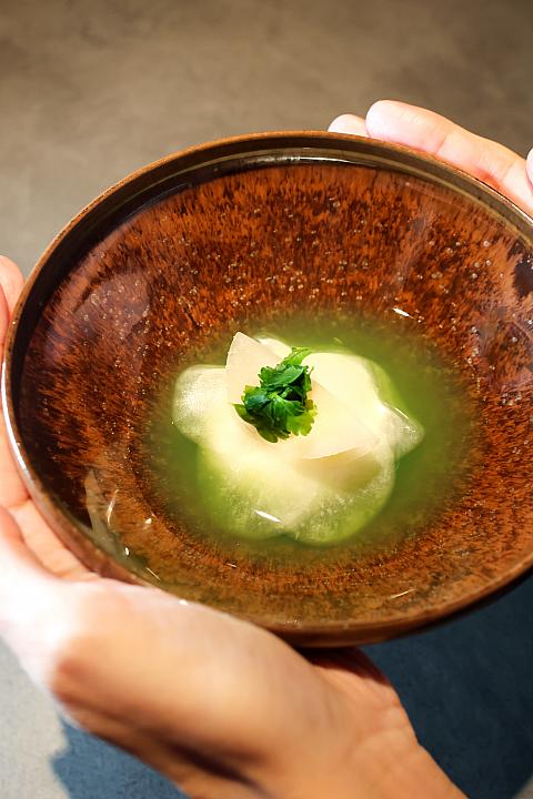 冷たい料理から温かな料理へ。立ち上がる海鮮やパセリの香りがさらなる食欲を刺激します。出されたのは、ふんわりとした蛤の真薯とシャキシャキの蕪。やさしい味わいのお出汁がそれぞれを1つにまとめています。
