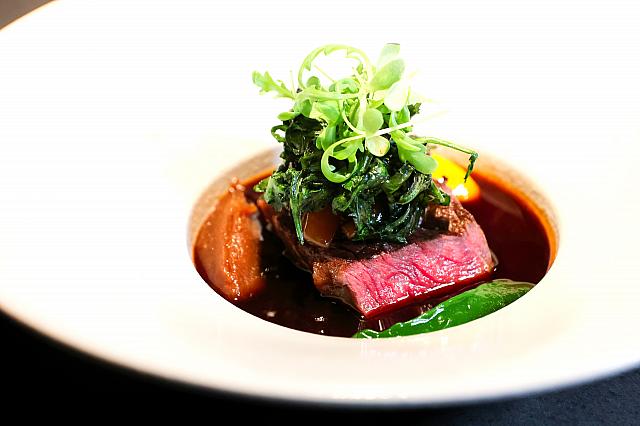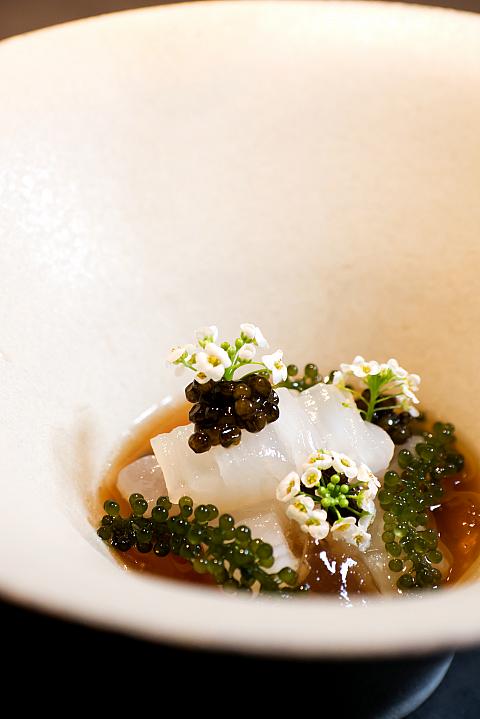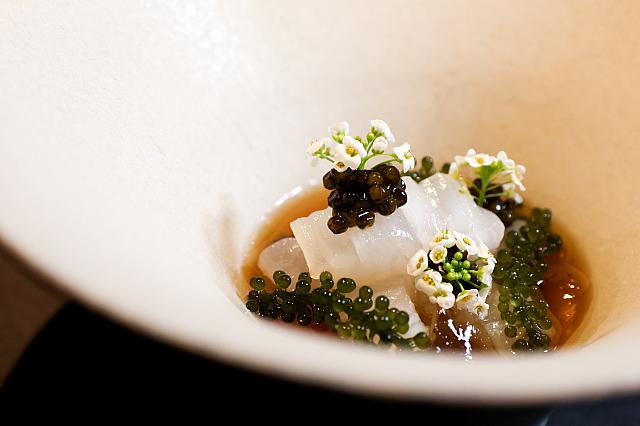 柔らかくも適度な弾力のあるイカをごぼうの風味漂う甘酢ソースと共にいただきます。口の中でプチプチッとはじけるキャビアと海ぶどうの食感も楽しい1皿です。見た目も華やかなエディブルフラワーに心躍ります。