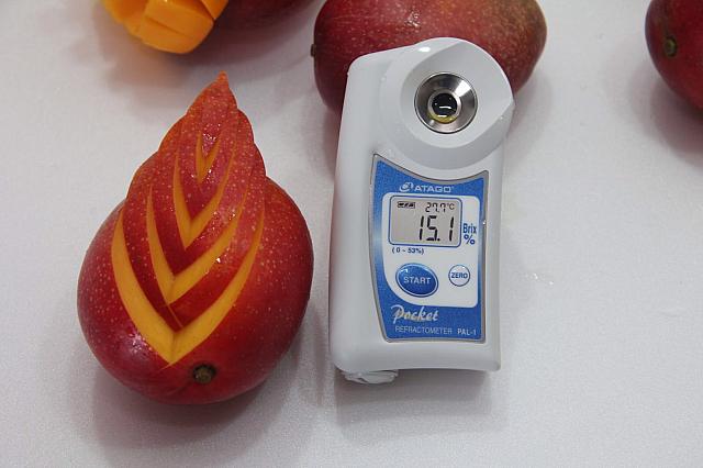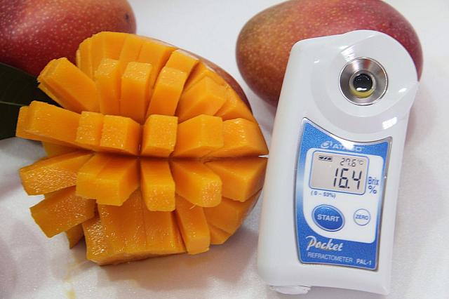 特に日本へ直送されるマンゴーは、台湾産アップルマンゴーの中でも最高級品を厳選、箱詰め前に糖度を測定しています。一般の台湾市場に並ぶマンゴーは糖度10~14度ですが、日本へ輸出される産地直送マンゴーの甘さは12~18度