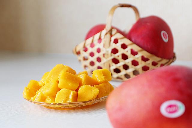 愛文マンゴーは赤く、ヘタ周りがふっくらとした弾力あれば完熟のサイン。甘いトロピカルな香りも見逃さないでください。