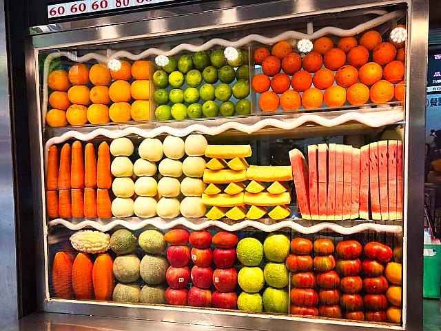 聞くと、中のフルーツは日替わりで固定ではありません。ミックスジュースには7種類のフルーツが1つずつ入っているそうです。「珍果」はフルーツが同じなら、カットフルーツ・ジュースともに同じ値段というのが多いのですが、ミックスカットフルーツ「綜合水果盤」は7種類のフルーツが各2つ入って70元。メニューの「汁」はジュース、「皿」がカットフルーツの意味です。