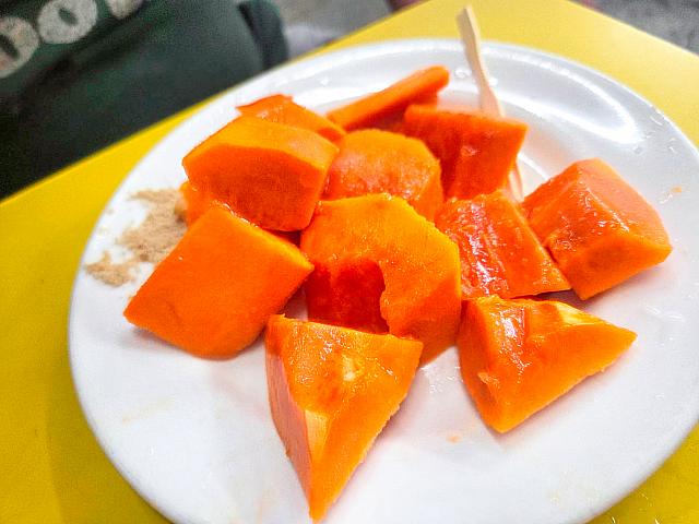 カットフルーツは各60元。パパイヤとスイカを選びました。どちらも台湾を代表する果物。瑞々しくて、いつ食べてもやっぱりおいしい!