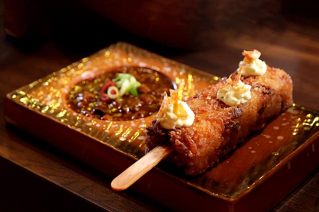 「炸米糕冰棍(120元)」も人気です。台湾の宴会でよく出てくる「紅蟳米糕」を、一人でも食べられるようにアイスキャンディー風にアレンジ。ホタテとスルメイカをおこわに混ぜ込み、桜エビを散らして色と香りを添えています。これに合わせるのは辛くない麻婆ソース。一口食べると、次の一口を急かしてくる味です。 |