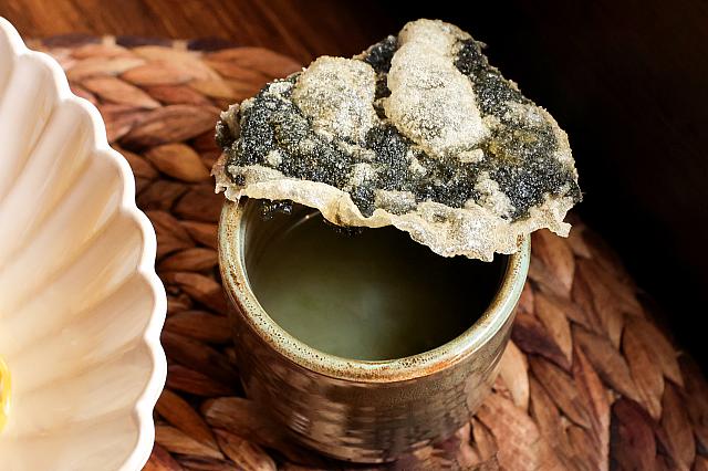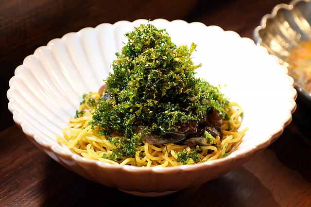 オープン以来人気ナンバー1メニューが「經典 燒椒皮蛋麵(140元)」。まず目に入る緑色の山はケールを素揚げしたもの。ケールって苦みが強いイメージがありましたが、油で揚げると甘くなるんですね!さらに臭みが気になるピータンも全く臭みがありません。まず蒸すことで臭みがなくなり、弾力も増すのだとか。糯米椒(甘みのある青唐辛子の一種)を炙って作る「燒椒醬」は辛さはほぼ感じず、うまみのみ。茹で具合もばっちりな麺にこれをのせ、最後にカラスミを振りかければ出来上がり!ピータン、ケール、燒椒醬のコンビネーションが抜群で、次から次へと箸が進みました。